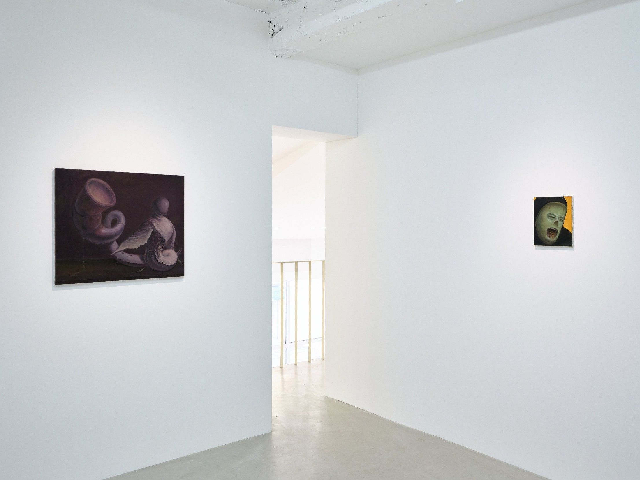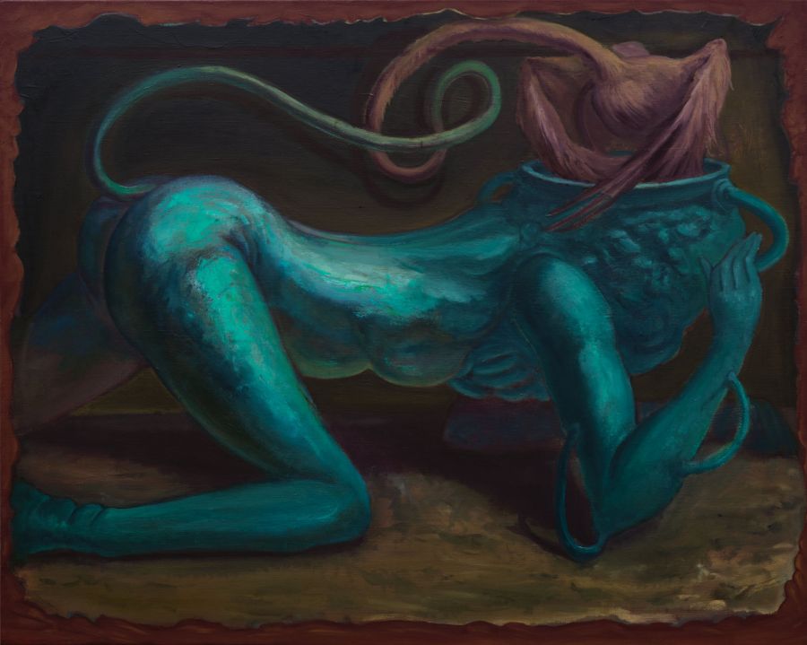 Seokwoo Nam’s paintings, rather than starting from what lies before the eye, take shape from images sourced from within. What concerns Nam is not the conversion of ideas into visible form, but the labor of handling images, turning and working them like clay, thinking through touch. Unreal figures appear in unfamiliar settings that evoke medieval mystery play stages or darkened antique furniture shops, drawing attention to the conditions that surround objects and the quiet pressures they bear. From LOOP to ssireum, the ouroboros recurs in Nam’s paintings, each time taking a different form. The positions of biting and being bitten remain indeterminate, leaving the image suspended in tension. A similar tension surfaces in A Musical Instrument That Can Be Handled (2026). Sitting at the edge of what counts as an instrument, the depicted object resists being fully defined as a melody-making device and instead serves as a means of sensing whether contact can occur.