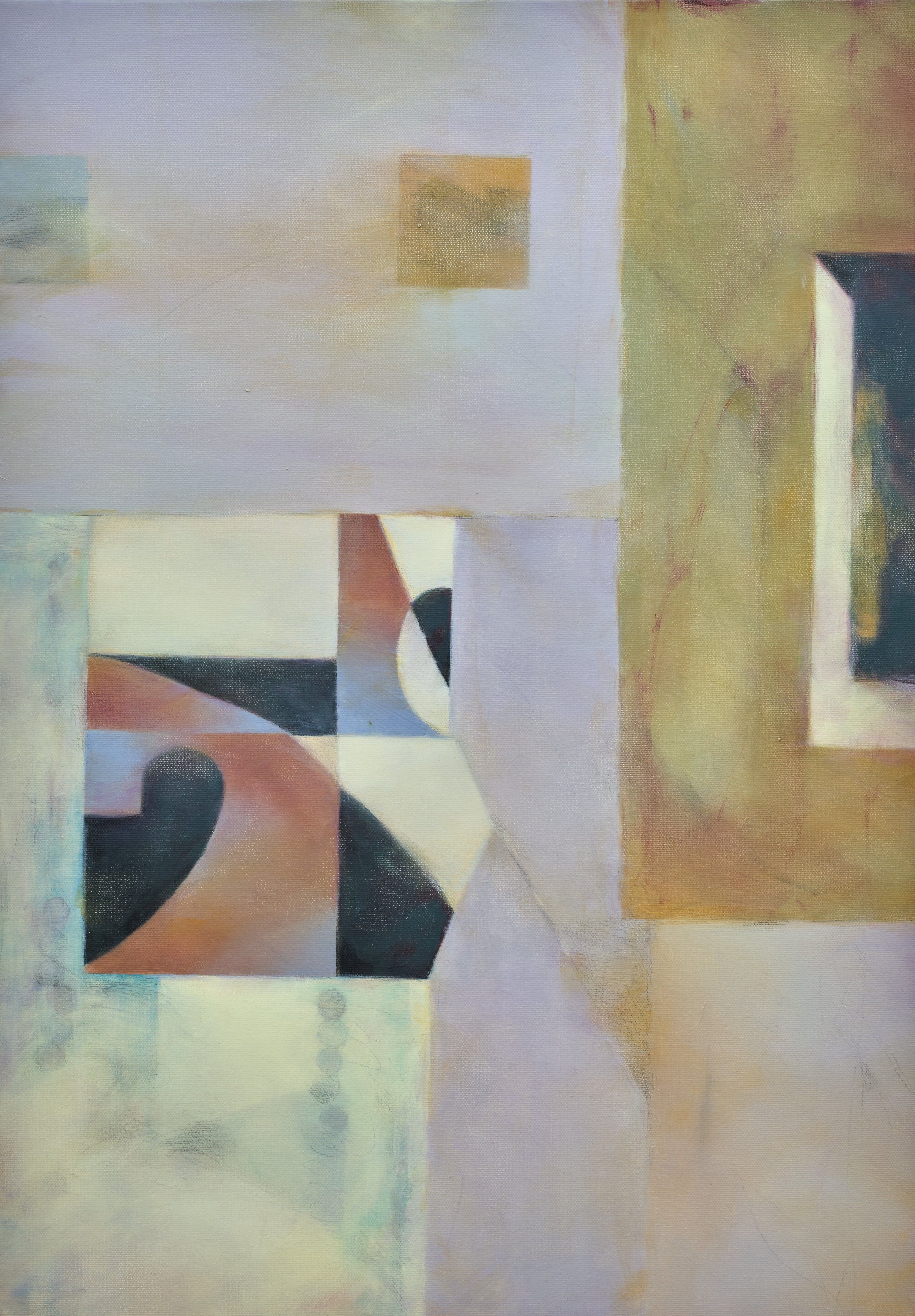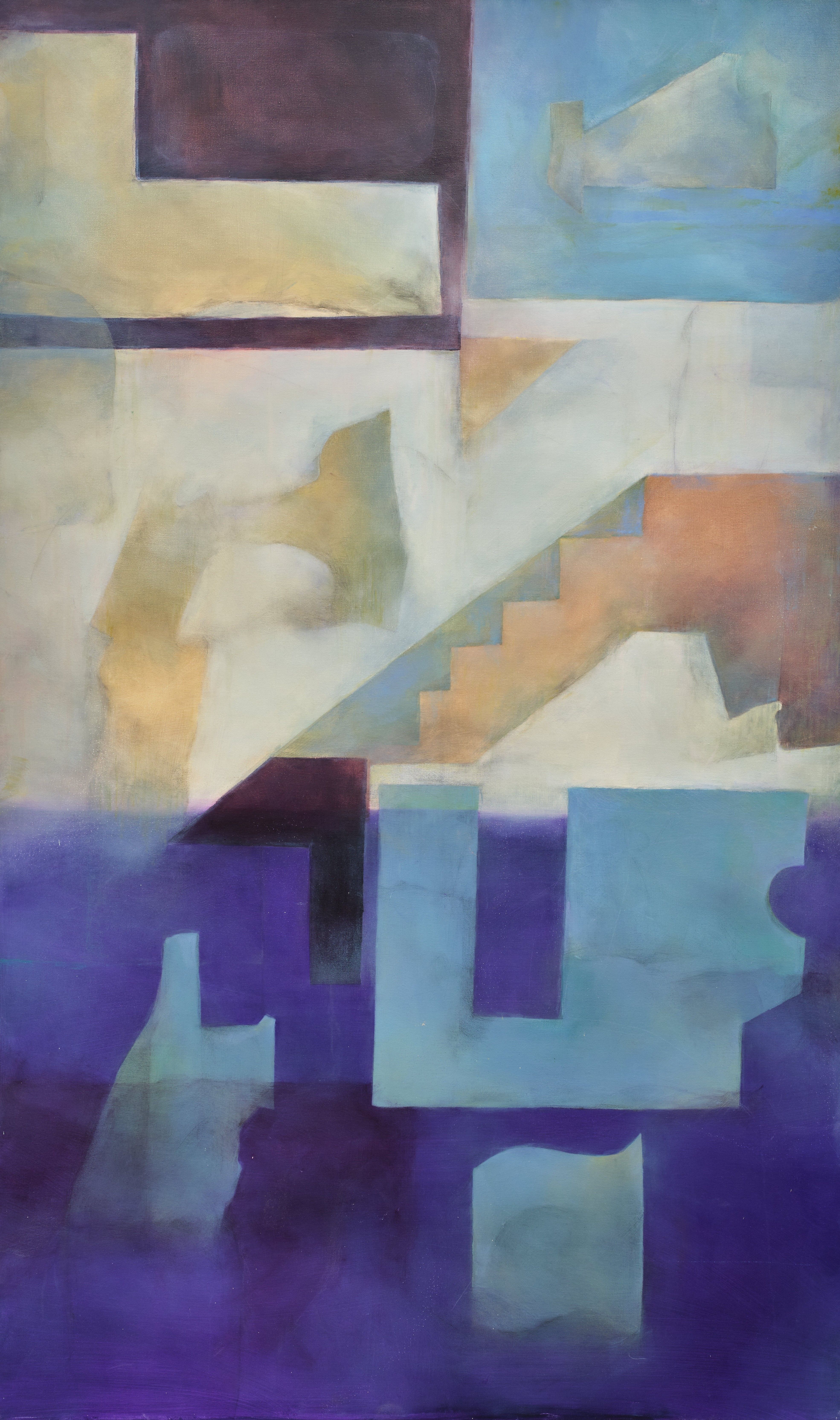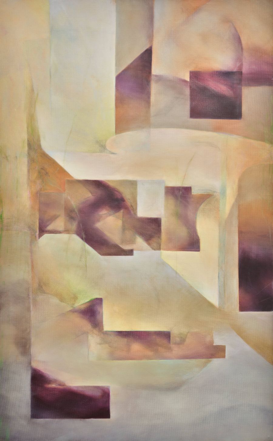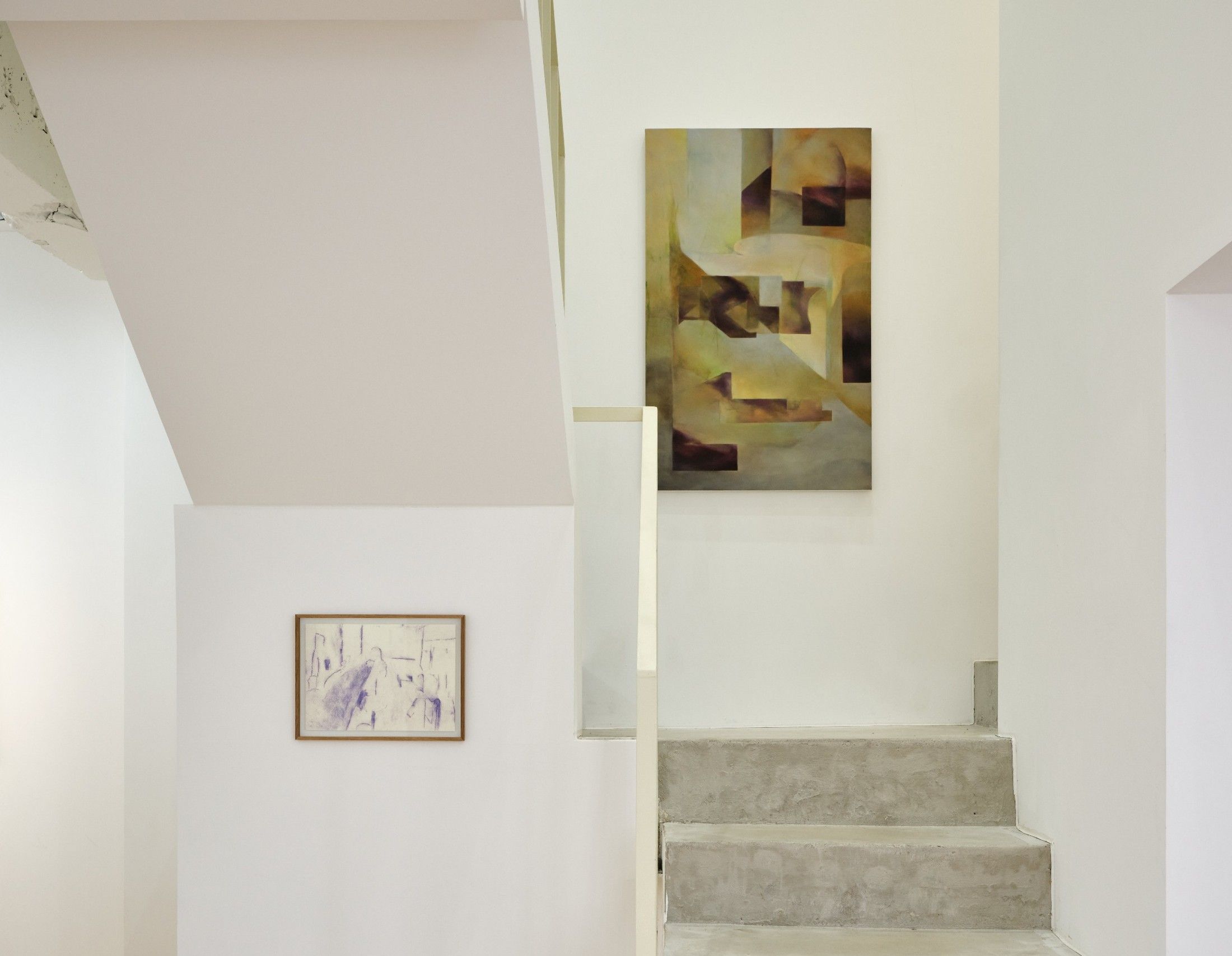 Sihyeon Lee through the articulation of color and plane renders perceptible the invisible layers that underlie human experience. The abstract forms that appear on the canvas are drawn from familiar spaces, yet Lee is not concerned with reproducing forms or pursuing formal inquiry. Rather, the artist attends to the ways in which the ambient layers, lingering traces of interactions, and social rhythms elicit perceptual responses before it surfaces into consciousness. Lee’s paintings explore the non-conscious phase embedded in the act of seeing itself. In ama, what appears as a landscape inflected with abstraction turns out instead to operate as a diagram, mapping perception as it remains in flux with the world. In dagyeong, converging lines and planes orient toward a central vanishing point without enacting perspective, instead revealing how affect organizes itself along the imprints left by objects, events and relations. Graphite lines and sanded abrasions on Lee’s oil-painted surfaces are read not as compositional elements but as indexical marks of perception in action.