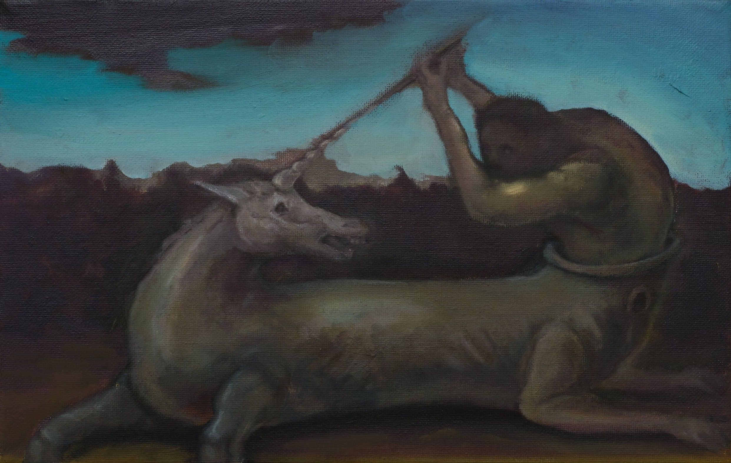 남석우의 회화는 눈앞의 대상보다는 내면의 상에서 출발한다. 작가가 의미를 두는 것은 관념 속 이미지를 눈에 보이는 형상으로 실체화하는 것이 아니라 오히려 그것을 끊임없이 뒤집어 보고 진흙처럼 매만지는 촉각적 과정 자체이다. 중세 유럽의 신비극 무대나 불 꺼진 고가구점 같은 생경한 공간에서 알 수 없는 힘과 사투하는 비현실적 존재들은 대상이 놓인 조건과 그것이 대상에 가하는 소리 없는 압박을 의식하게 한다. 〈루프〉에서부터 〈씨름〉까지 남석우의 화면에서 거듭해서 등장하는 이른바 우로보로스 형상은 매번 새로운 모습을 하고 있지만, 무는 쪽과 물리는 쪽이 언제나 불분명하다는 점에서 관계가 성립되는 방식보다는 일체의 관계가 맺어지기 이전의 긴장을 지속시키는데 작가의 관심이 있음을 암시한다. 악기인 것과 악기 아닌 것의 경계에 있는 〈다룰 수 있는 악기〉(2026) 속 오브제가 멜로디를 생산하는 도구라기보다 외부와의 소통 가능성을 가늠하는 매개로 도입되는 것과 비슷한 맥락이다.